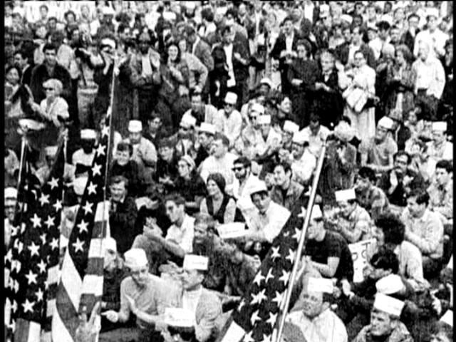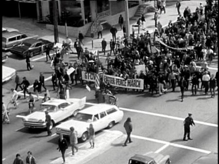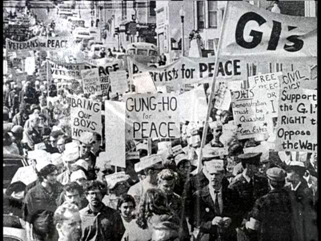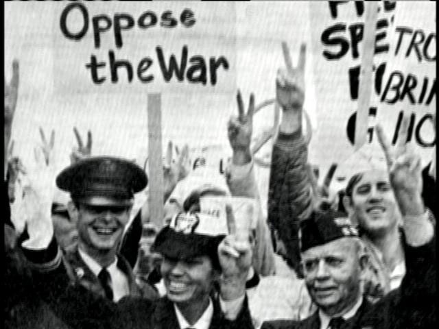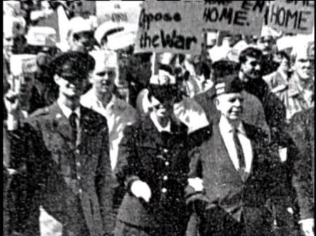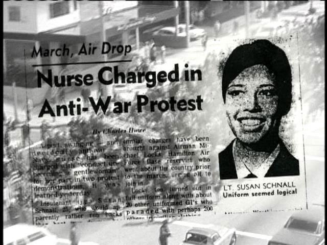Oppose the War BRING OUR BOYS HOME and I could wear my uniform protesting the United States' involvement in Vietnam. NARRATOR: Susan Schnall was court-martialed for making a political statement while in uniform. [March, Air