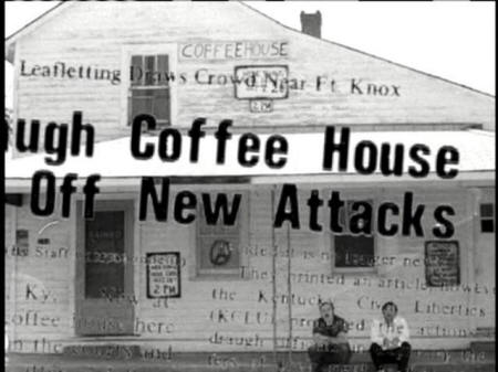STEVE GOLDSMITH, CIVILIAN ORGANIZER: I spent 13 days in this little jail that still had a trap door from when they did lynchings before the Civil War. There was a hook up on the wall. What they were trying to do was drive us out of town, but we weren't going away. The Battle at Muldraugh Hill Leafletting Draws Crowd Near Ft. Knox They indicted six people for two offenses: one was maintaining a place visited by idle and evil disposed people. We always thought, "idle and evil-disposed people," you mean, like soldiers? HAL MUSKAT, U.S. ARMY: The whole emphasis of the coffeehouse in giving us an off-base center to congregate and meet was a good thing, but in defending those centers to exist it pulled us off the base, which was where we were effective and powerful. |