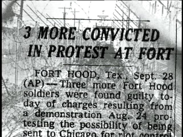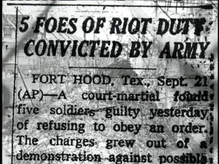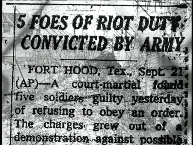 I got cut. I got hit right here with a bayonet. And then every now and then they opened this formation up, and a group of MPs come in and grab a brother, and take him back in the back, and beat the shit out of him. He was screaming in the back. Damn! [5 FOES OF RIOT DUTY CONVICTED BY ARMY] Black GIs Refuse 3 MORE CONVICTED IN PROTEST AT FORT More GI's Resist |
