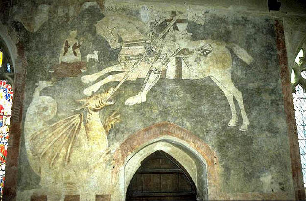 Photo: T. Marshall This incomplete but splendid example of St. George fighting the Dragon fills a large area of the south wall at Broughton. The roof was restored and made lower at some time after it was painted in the later 15th century and the head and shoulders of George himself have gone as a result. Medieval artists invariably painted horses well, but here the Dragon too is very stylishly rendered indeed as St. George thrusts his spear into its mouth. The saint bears his Red Cross on his shield; his elaborate armour helps to date the painting. But in any case, probably only after the English victory at Azincourt (Agincourt) in 1415 would St. George, who from this point effectively becomes the patron saint of England,² be painted in such bravura fashion - one 14th century painting at Little Kimble in Buckinghamshire and even shows him simply standing with spear and shield. George was said to have appeared above the Azincourt battlefield to rally the English troops, whereas in sad fact, of course, the French defeat, in which a huge proportion of the French aristocracy was wiped out, had more to do with the sodden ground and the skill of the unencumbered English longbowmen. But English medieval church painters, to their credit, concentrated on the original Legend of the Saint in which he defeats a poison-breathing dragon that has been terrorising the neighbourhood and people. The story is in the Golden Legend and Caxton translated and printed it. The Dragon, unappeased by regular offerings of sheep, was eventually given a human victim chosen by lot. She was the king’s daughter. It was at this point in the story that George attacked the Dragon and led it captive with the princess’s girdle. He promised to destroy it completely if king and people would believe in Jesus Christ and be converted, to which condition they agreed. One of the most interesting features of this painting is the inclusion of the princess, who is shown as a small figure at the left, in front of some faded painted buildings, probably intended for the king’s palace. To the right of her is something that looks like a lamb. If it is, then specific Christian references to the Agnus Dei and the Virgin (the virginal princess went out to meet her fate dressed as a bride) cluster around the story. It is not far from here to the idea of St. George as ‘Our Lady’s knight’, an idea which has been amplified by the recent discovery of the painting on the orb of the banner-staff in the Wilton Diptych (National Gallery, London). The inscription there reads - ‘This [England] is your dowry, O holy Virgin, wherefore O Mary, may you rule over it’.³ |