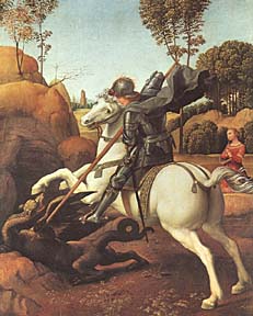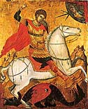 Because the themes are interrelated and affect each other, I present them chronologically. An essay on the theological considerations is planned as a separate, linked page. St George is the patron saint of England and among the most famous of Christian figures. But of the man himself, nothing is certainly known. Our earliest source, Eusebius of Caesarea, writing c. 322, tells of a soldier of noble birth who was put to death under Diocletian at Nicomedia on 23 April, 303, but makes no mention of his name, his country or his place of burial. According to the apocryphal Acts of St George current in various versions in the Eastern Church from the fifth century, George held the rank of tribune in the Roman army and was beheaded by Diocletian for protesting against the Emperor's persecution of Christians. George rapidly became venerated throughout Christendom as an example of bravery in defence of the poor and the defenceless and of the Christian faith. George was probably first made well known in England by Arculpus and Adamnan in the early eighth century. The Acts of St George, which recounted his visits to Caerleon and Glastonbury while on service in England, were translated into Anglo-Saxon. Among churches dedicated to St George was one at Doncaster in 1061. George was adopted as the patron saint of soldiers after he was said to have appeared to the Crusader army at the Battle of Antioch in 1098. Many similar stories were transmitted to the West by Crusaders who had heard them from Byzantine troops, and were circulated further by the troubadours. When Richard 1 was campaigning in Palestine in 1191-92 he put the army under the protection of St George. Because of his widespread following, particularly in the Near East, and the many miracles attributed to him, George became universally recognized as a saint sometime after 900. Originally, veneration as a saint was authorized by local bishops but, after a number of scandals, the Popes began in the twelfth century to take control of the procedure and to systematize it. A lesser holiday in honour of St George, to be kept on 23 April, was declared by the Synod of Oxford in 1222; and St George had become acknowledged as Patron Saint of England by the end of the fourteenth century. In 1415, the year of Agincourt, Archbishop Chichele raised St George's Day to a great feast and ordered it to be observed like Christmas Day. In 1778 the holiday reverted to a simple day of devotion for English Catholics. The banner of St George, the red cross of a martyr on a white background, was adopted for the uniform of English soldiers possibly in the reign of Richard 1, and later became the flag of England and the White Ensign of the Royal Navy. In a seal of Lyme Regis dating from 1284 a ship is depicted bearing a flag with a cross on a plain background. During Edward III's campaigns in France in 1345-49, pennants bearing the red cross on a white background were ordered for the king's ship and uniforms in the same style for the men at arms. When Richard II invaded Scotland in 1385, every man was ordered to wear 'a signe (sic) of the arms of St George', both before and behind, whilst death was threatened against any of the enemy's soldiers 'who do bear the same crosse or token of Saint George, even if they be prisoners'. The fame of St George throughout Europe was greatly increased by the publication of the Legenda Sanctorum (Readings on the Saints), later known as the Legenda Aurea (The Golden Legend) by James of Voragine in 1265. The name 'golden legend' does not refer to St George but to the whole collection of stories, which were said to be worth their weight in gold. It was this book which popularized the legend of George and the Dragon. The legend may have been particularly well received in England because of a similar legend in Anglo-Saxon literature. St George became a stock figure in the secular miracle plays derived from pagan sources which continued to be performed at the beginning of spring. The origin of the legend remains obscure. It is first recorded in the late sixth century and may have been an allegory of the persecution of Diocletian, who was sometimes referred to as 'the dragon' in ancient texts. The story may also be a christianized version of the Greek legend of Perseus, who was said to have rescued the virgin Andromeda from a sea monster at Arsuf or Jaffa, near Lydda (Diospolis), where the cult of St George grew up around the site of his supposed tomb. In 1348, George was adopted by Edward III as principal Patron of his new order of chivalry, the Knights of the Garter. Some believe that the Order took its name from a pendant badge or jewel traditionally shown in depictions of Saint George. The insignia of the Order include a Collar and Badge Appendant, known as the George. The badge is of gold and presents a richly enamelled representation of St George on horseback slaying the dragon. A second medal, the Lesser George, also depicting George and the dragon, is worn attached to the Sash. The objective of the Order was probably to focus the efforts of England on further Crusades to reconquer the Holy Land. The earliest records of the Order of the Garter were destroyed by fire, but it is believed that either in 1348 or in 1344 Edward proclaimed St George Patron Saint of England. Although the cult of St George was suppressed in England at the Reformation, St George's Chapel, Windsor, completed in stages from 1483 to 1528, has remained the official seat of the Order, where its chapters assemble. The Monarch and the Prince of Wales are always members, together with 24 others and 26 Knights or Ladies Companion. Much later, in 1818, the Prince Regent, later George IV, created the Most Distinguished Order of St Michael and St George to recognize exemplary service in the diplomatic field. The Order was founded to commemorate the British protectorate of the Ionian islands and Malta, which had begun in 1814. Originally membership was limited to inhabitant