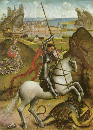 Rogier van der Weyden, Saint George and the Dragon, 1432-1435, National Gallery of Art, Ailsa Mellon Bruce Fund. Brave Saint George, dressed in shiny armor, is trying to rescue a princess from a terrible dragon that is terrorizing her town. |