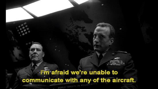 General Turgidson: I'm afraid we're unable to communicate with any of the aircraft. President: Why? General Turgidson: As you may recall, sir ... ... one of the provisions of Plan R provides ...