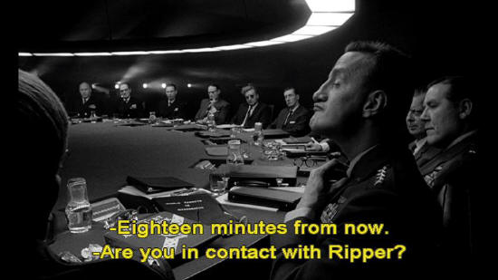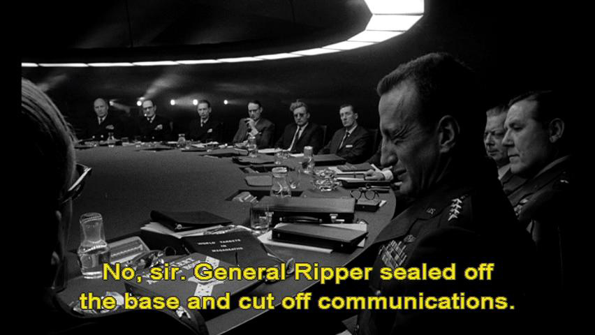 ... it's going to take us about two days to transmit them all. President: How soon will planes penetrate Russian radar cover? General Turgidson: Eighteen minutes from now. President: Are you in contact with Ripper? General Turgidson: No, sir. General Ripper sealed off the base, and cut off communications.