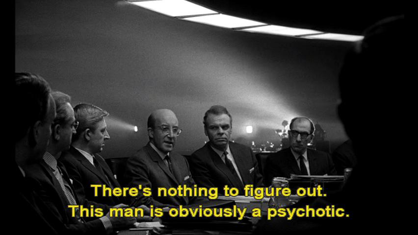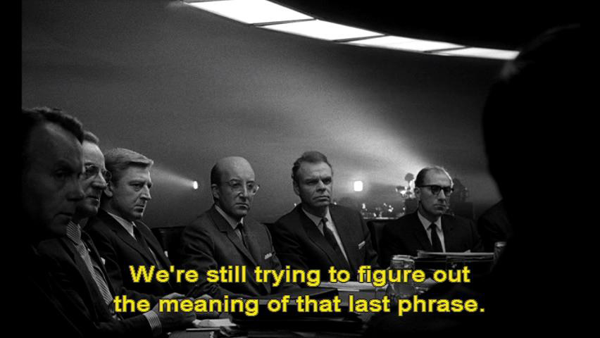 Then he hung up. We're still trying to figure out the meaning of that last phrase. President: There's nothing to figure out. This man is obviously a psychotic. General Turgidson: I'd like to hold off judgment on a thing like that, sir, until all the facts are in.