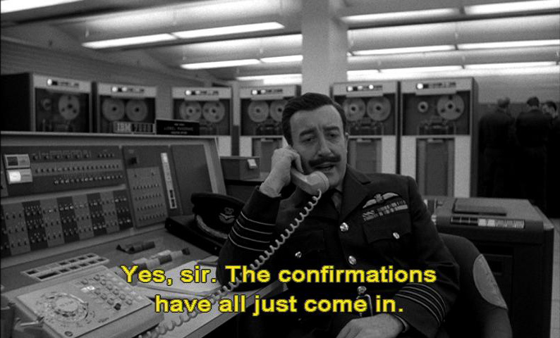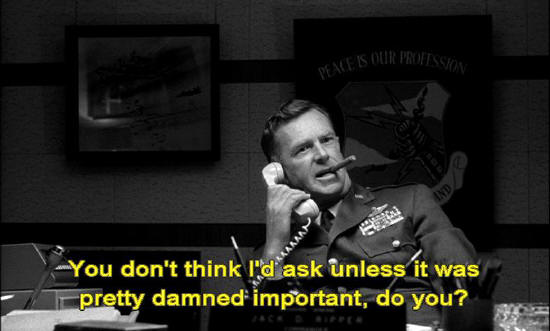 General Jack Ripper: You don't think I'd ask unless it was pretty damned important, do you? Capt. Mandrake: No, I don't, sir, no. General Jack Ripper: Let's see if we can stay on the ball. General Jack Ripper: Has the wing confirmed holding at their fail-safe points? Capt. Mandrake: Yes, sir. The confirmations have all just come in.