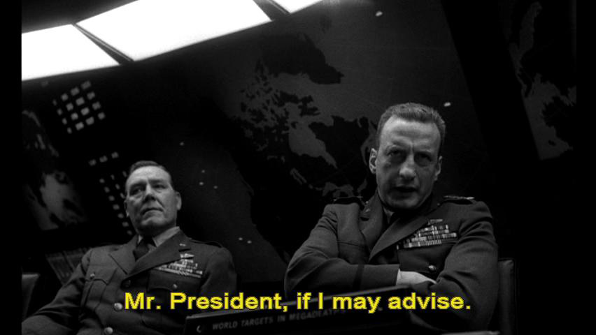 General Turgidson: Mr. President, if I may advise. Under a condition red, it is standard procedure that the base be sealed off ... ... and the base defended by base security troops. Any force trying to enter there would certainly encounter heavy casualties.