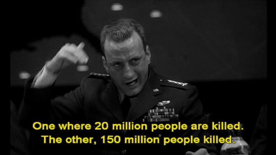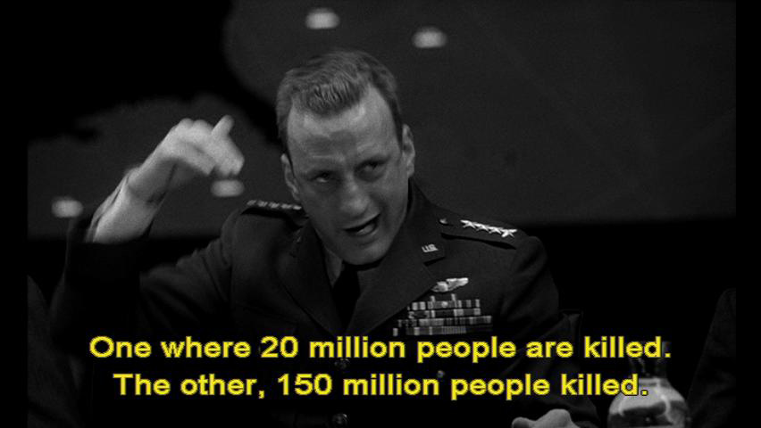 To choose between two admittedly regrettable ... ... but nevertheless distinguishable postwar environments. One where 20 million people are killed. The other, 150 million people killed. President: You're talking about mass murder, General, not war.