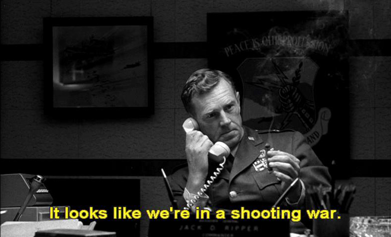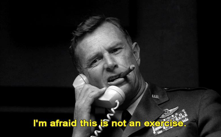 General Jack Ripper: I'm afraid this is not an exercise. Capt. Mandrake: Not an exercise, sir? General Jack Ripper: I shouldn't tell you this, but you're a good officer and have a right to know. It looks like we're in a shooting war.