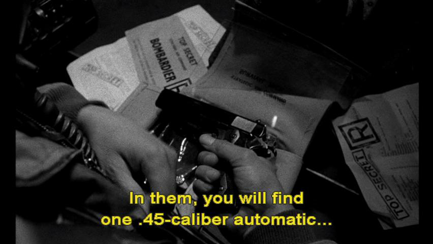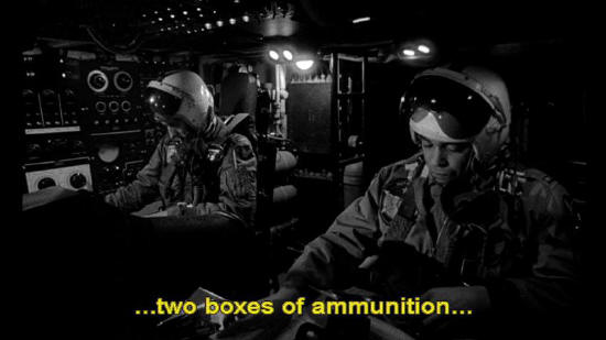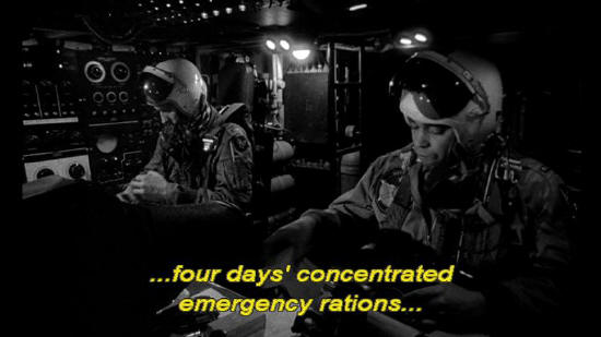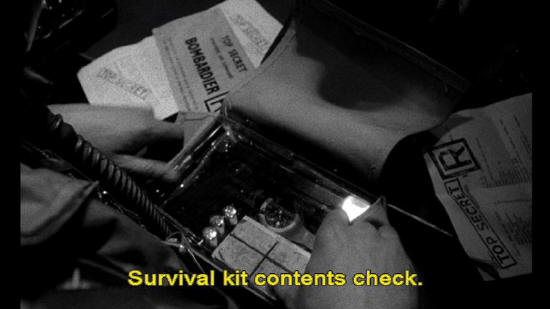 Major Kong: Survival kit contents check. In them, you will find one .45 caliber automatic ... ... two boxes of ammunition ... ... four days' concentrated emergency rations ...