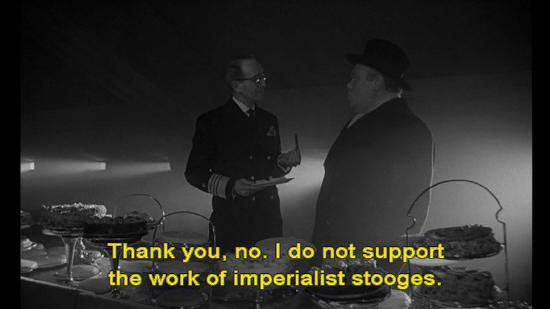 Ambassador Alexi: I will have poached eggs. And bring me some cigars, please. Havana cigars. Waiter: And that will be all for you, sir? I'll see to it right away. Water 2: Try one of these Jamaican cigars, Ambassador. They're good. Ambassador Alexi: Thank you, no. I do not support the work of imperialist stooges.
