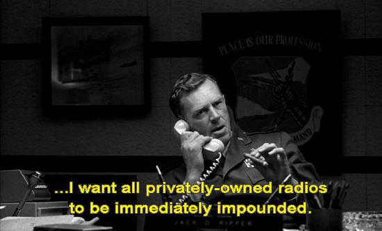 General Jack Ripper: Now, last, and possibly most important ... ... I want all privately-owned radios to be immediately impounded. They might be used to issue instructions to saboteurs. As I previously arranged, Air Police will have lists of all owners.