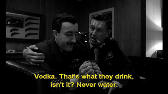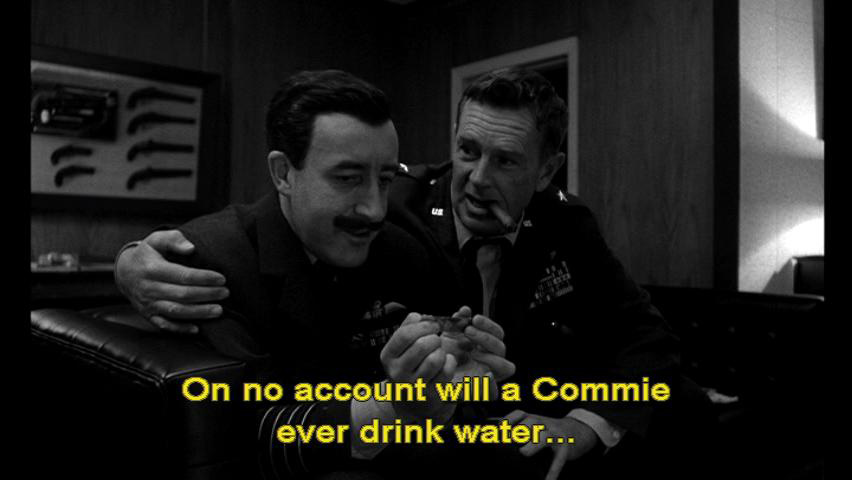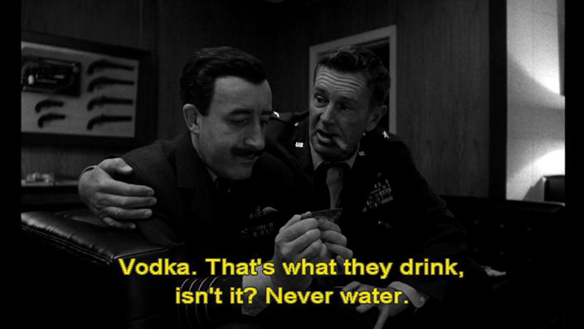 Captain Mandrake: Well, no, I can't say I have, Jack. General Jack Ripper: Vodka. That's what they drink, isn't it? Never water. Captain Mandrake: Well, I believe that's what they drink, Jack, yes. General Jack Ripper: On no account will a Commie ever drink water ...