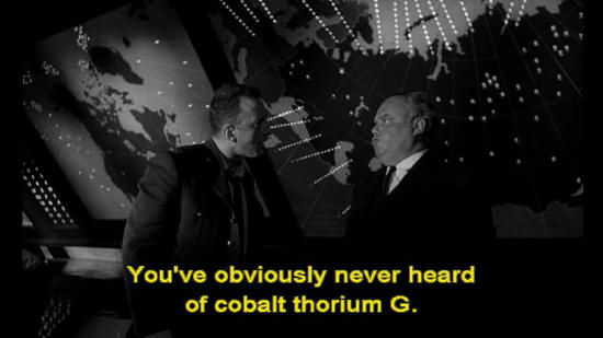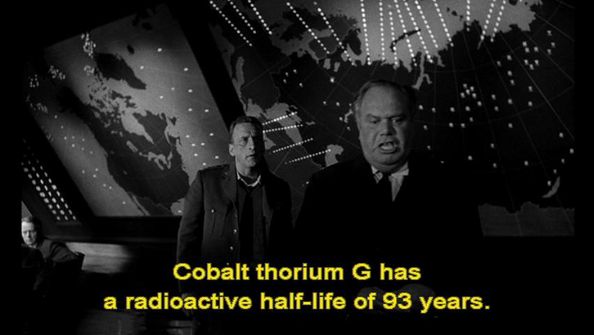 Ambassador Alexi: You've obviously never heard of cobalt thorium G. General Turgidson: No, what about it? Ambassador Alexi: Cobalt thorium G has a radioactive half-life of 93 years. If you take, say, 50 H bombs in the 100 megaton range ...