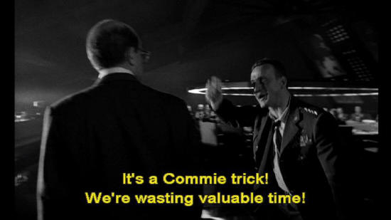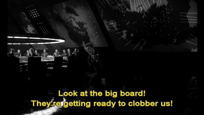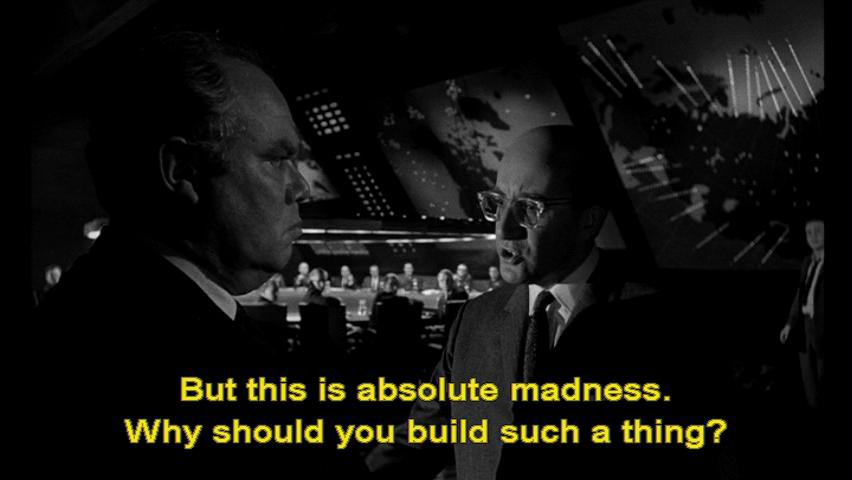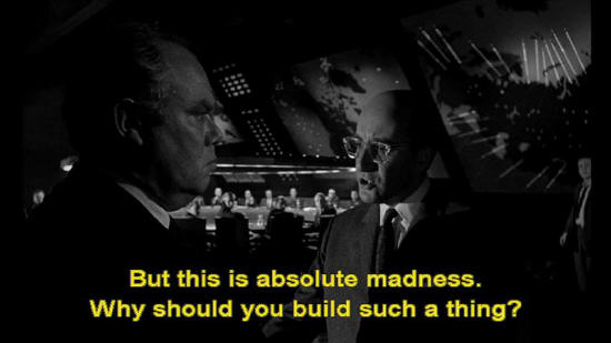 General Turgidson: It's a Commie trick! We're wasting valuable time! Look at the big board! They're getting ready to clobber us! President: But this is absolute madness. Why should you build such a thing?