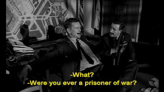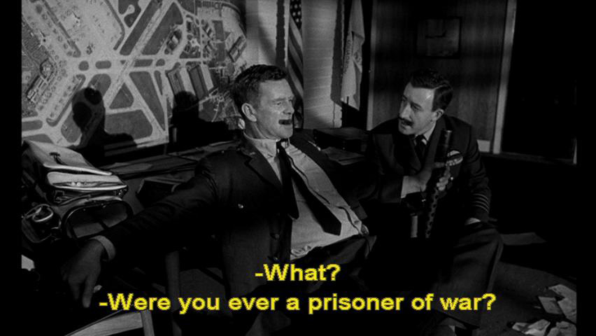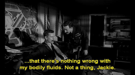 ... that there's nothing wrong with my bodily fluids. Not a thing, Jackie. General Jack Ripper: Mandrake, were you ever a prisoner of war? Captain Mandrake: Well, Jack, the time's running very -- What? General Jack Ripper: Were you ever a prisoner of war?