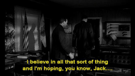 Captain Mandrake: Yes, well, of course you can, Jack. Of course you can. You can. I'm a religious man myself, you know, Jack. I believe in all that sort of thing and I'm hoping, you know, Jack ... You've dropped your gun, Jack. Yes ... You know what ...?