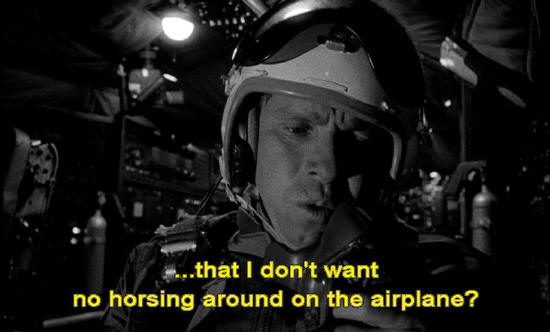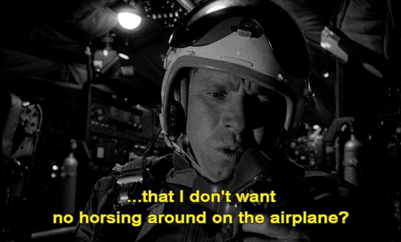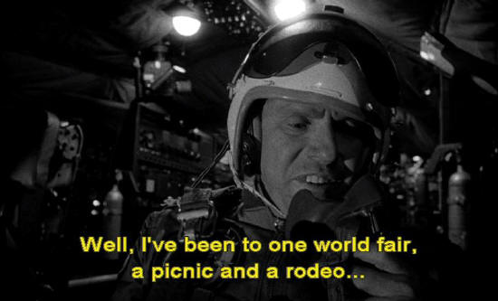 ... that I don't want no horsing around on the airplane? Goldie: I'm not horsing around, sir, that's how it decodes. Major Kong: Well, I've been to one world fair, a picnic and a rodeo ... ... and that's the stupidest thing I ever heard over earphones.