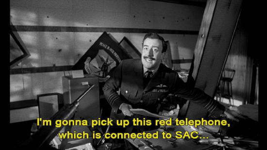 ... and sent the whole wing to attack the Soviets? Colonel: What are you talking about? Captain Mandrake: I'll tell you what I'm talking about. I'm gonna pick up this red telephone, which is connected to SAC ... ... and I hope --
