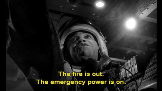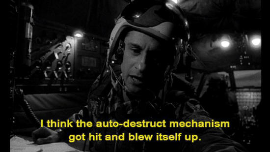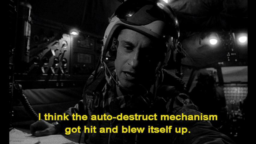 I think the auto-destruct mechanism got hit and blew itself up. Bombardier: The fire is out. The emergency power is on. Everything seems to check out all right. Will advise.