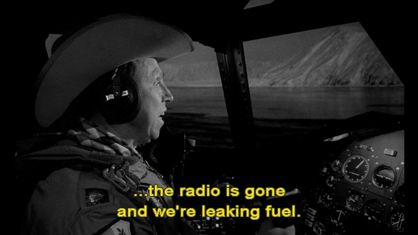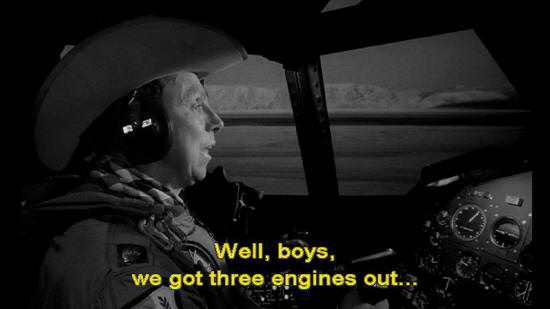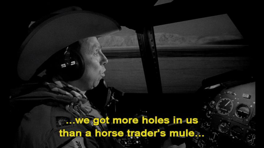 Major Kong: Well, boys, we got three engines out ... .. we got more holes in us than a horse trader's mule .. ..the radio is gone and we're leaking fuel. If we was flying any lower, we'd need sleigh bells on this thing.