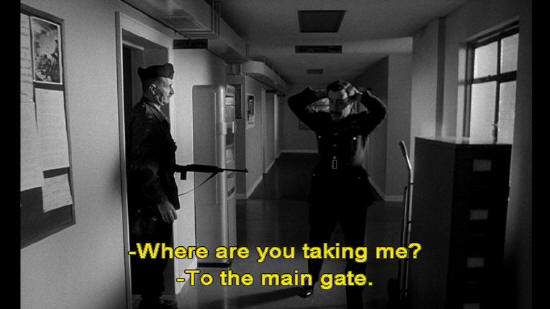 Colonel: The other way. Captain Mandrake: Where are you taking me? Colonel: To the main gate. Captain Mandrake: Colonel! Colonel, I must know what you think has been going on here.