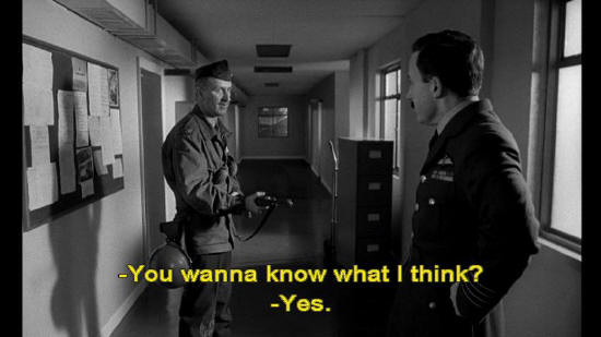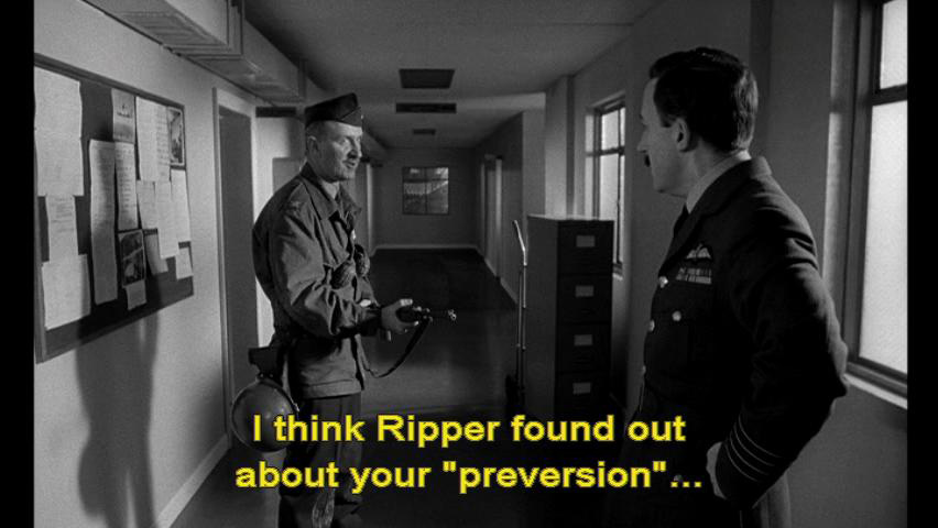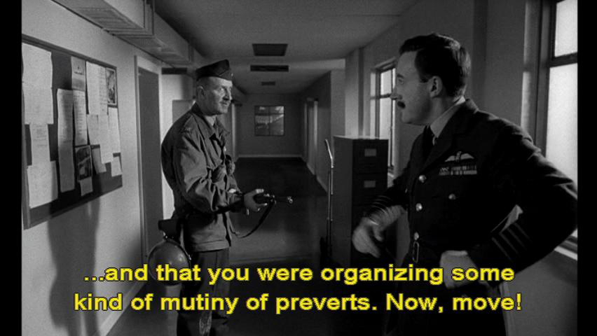 Colonel: You wanna know what I think? Captain Mandrake: Yes. Colonel: I think you're some kind of deviated "prevert." I think Ripper found out about your "preversion" ... ... and that you were organizing some kind of mutiny of preverts. Now, move!
