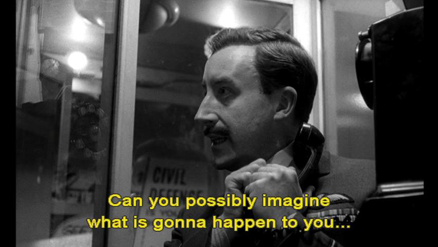 There may be some change in there. Colonel: That's private property. Captain Mandrake: Can you possibly imagine what is gonna happen to you ... ... your frame, outlook, way of life and everything ...
