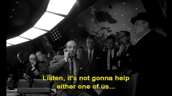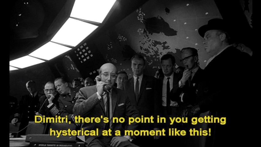 Listen, it's not gonna help either one of us ... ... if the doomsday machine goes off, now, is it? Dimitri, there's no point in you getting hysterical at a moment like this!
