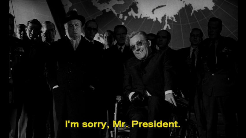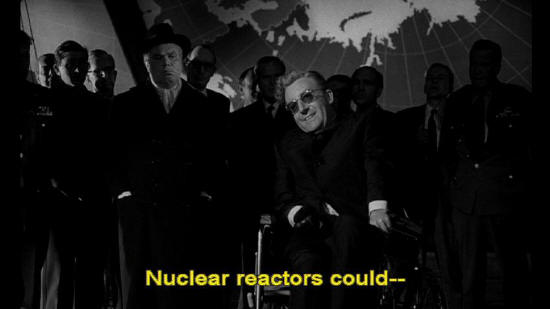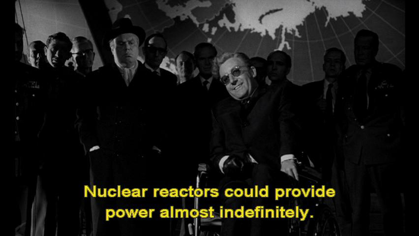 Dr. Strangelove: It would not be difficult, mein Fuhrer. Nuclear reactors could -- I'm sorry, Mr. President. Nuclear reactors could provide power almost indefinitely.