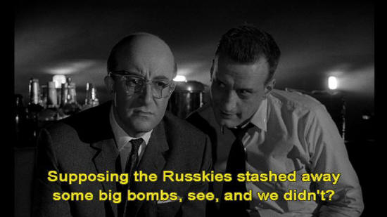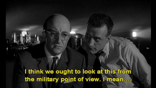Dr. Strangelove: Thank you, sir. General Turgidson: I think we ought to look at this from the military point of view. I mean ... Supposing the Russkies stashed away some big bombs, see, and we didn't?