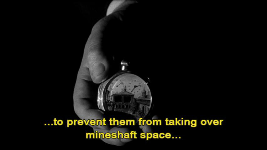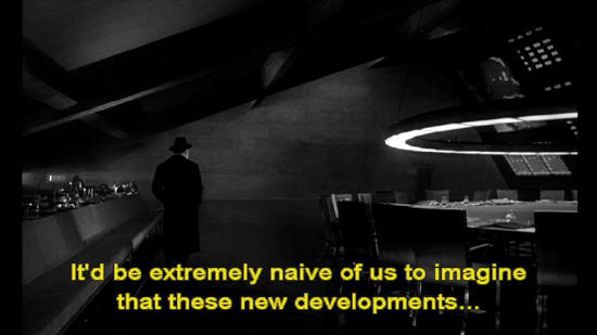 General Turgidson: Yeah, it'd be extremely naive of us to imagine that these new developments ... ... are gonna cause any change in Soviet expansionist policy! I mean, we must be increasingly on the alert ... ... to prevent them from taking over mineshaft space ...