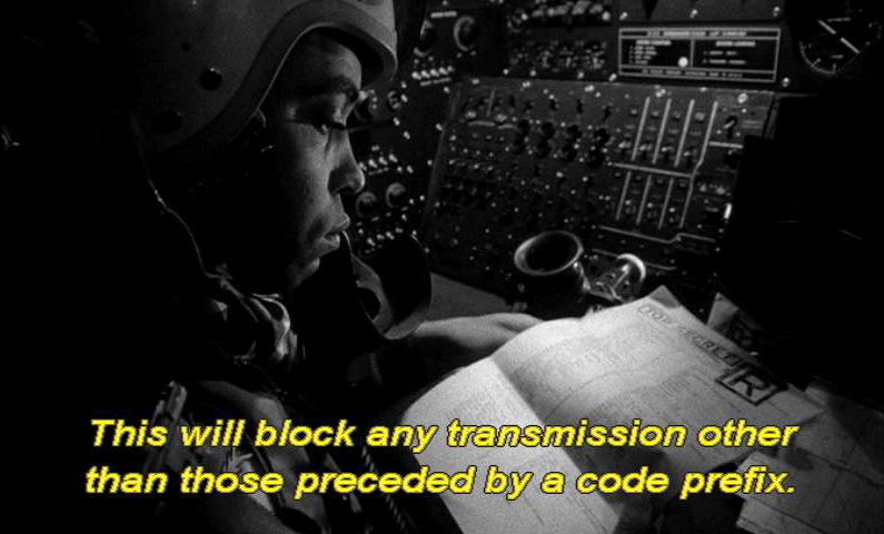 ... on the dials of the CRM. This will block any transmission other than those preceded by a code prefix." Standby by to set code prefix. Goldie: Roger. Ready to set code prefix. Major Kong: Set code prefix.