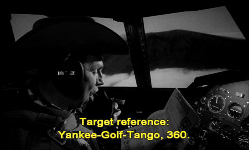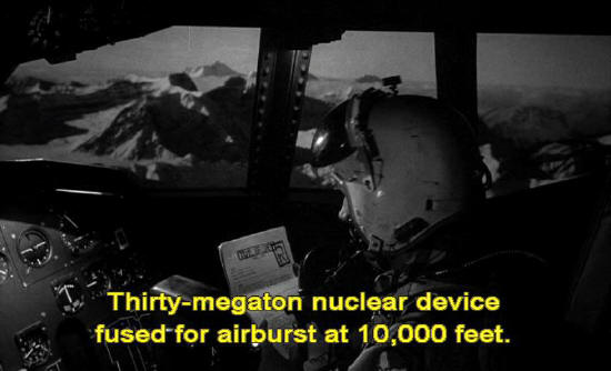Major Kong: Primary target: the ICBM complex at Laputa. Target reference: Yankee-Golf-Tango, 360. Thirty-megaton nuclear device fused for airburst at 10,000 feet.