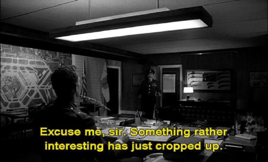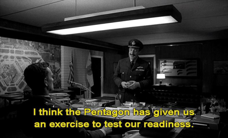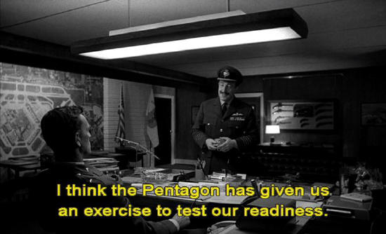 Captain Mandrake: Excuse me, sir. Something rather interesting has just cropped up. Listen to that. Music. Civilian broadcasting. I think the Pentagon has given us an exercise to test our readiness.