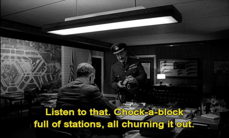 I think it's taking things too far. Our fellows will be inside Russian radar cover in 20 minutes. Listen to that. Chock-a-block full of stations, all churning it out. General Jack Ripper: Mandrake? Captain Mandrake: Yes, sir?