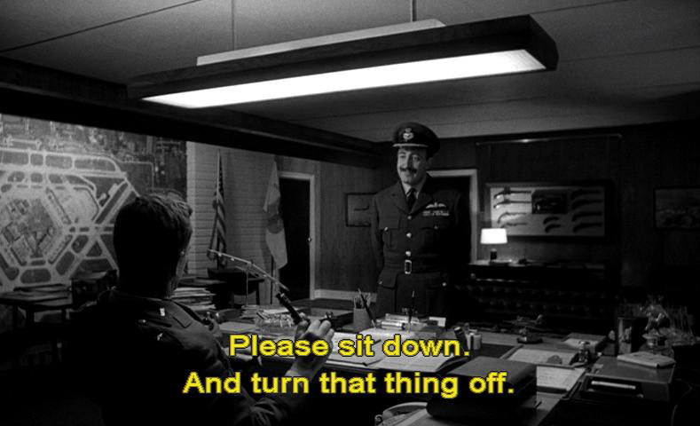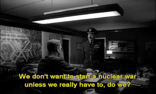 We don't want to start a nuclear war unless we really have to, do we? General Jack Ripper: Please sit down. And turn that thing off. Captain Mandrake: Yes, sir. What about the planes? Surely we must issue the recall code immediately.