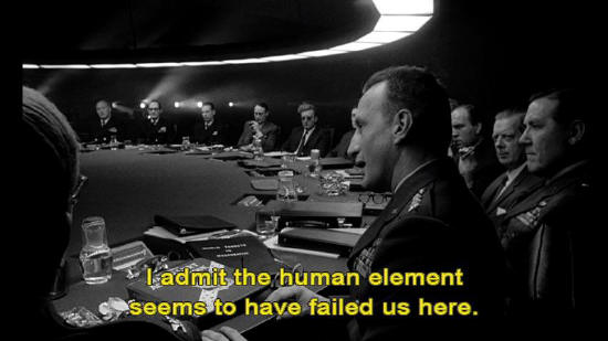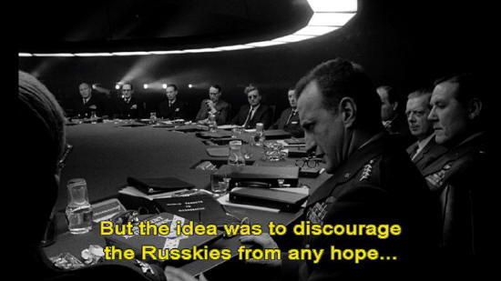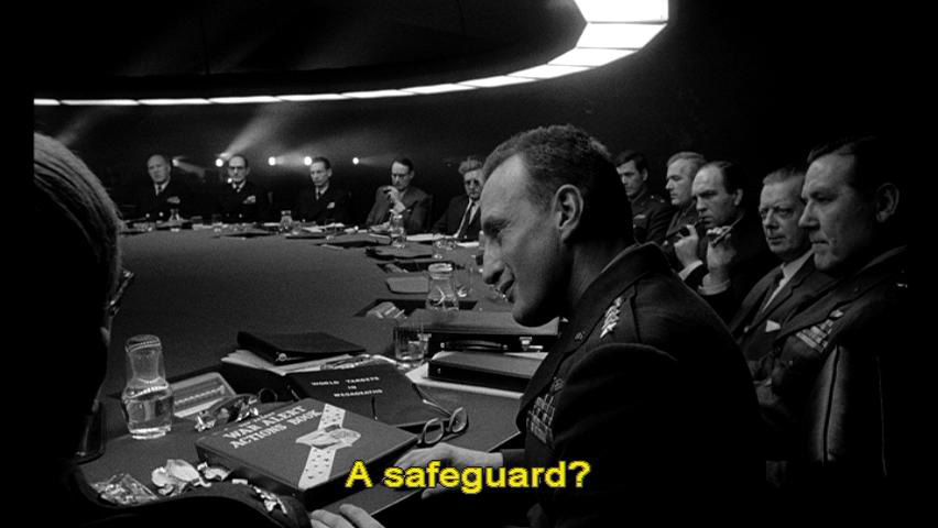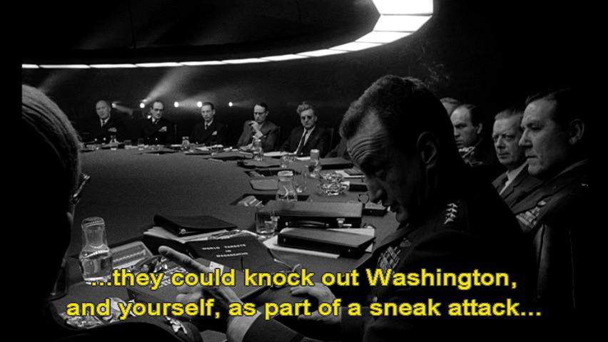 President: A safeguard? General Turgidson: I admit the human element seems to have failed us here. But the idea was to discourage the Russkies from any hope ... ... they could knock out Washington, and yourself, as part of a sneak attack ...