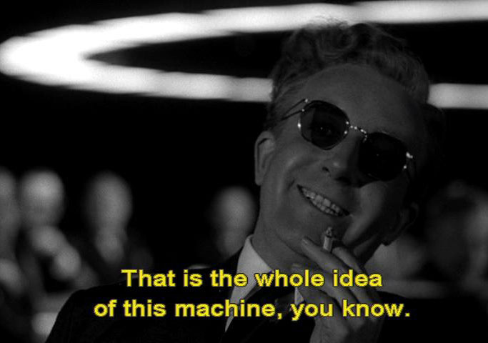 Stanley Kubrick, Terry Southern & Peter George (Screenplay transcribed from the movie by Tara Carreon, american-buddha.com) It is the stated position of the U.S. Air Force that their safeguards would prevent the occurrence of such events as are depicted in this film. Furthermore, it should be noted that none of the characters portrayed in this film are meant to represent any real persons living or dead. Narrator: For more than a year, ominous rumors had been privately circulating among high-level Western leaders that the Soviet Union had been at work on what was darkly hinted to be the ultimate weapon: a doomsday device. Intelligence sources traced the site of the top-secret Russian project to the perpetually fog-shrouded wasteland below the Arctic peaks of the Zhokhov Islands. What they were building, or why it should be located in such a remote and desolate place, no one could say. Columbia Pictures