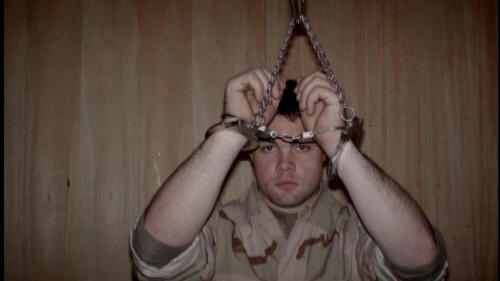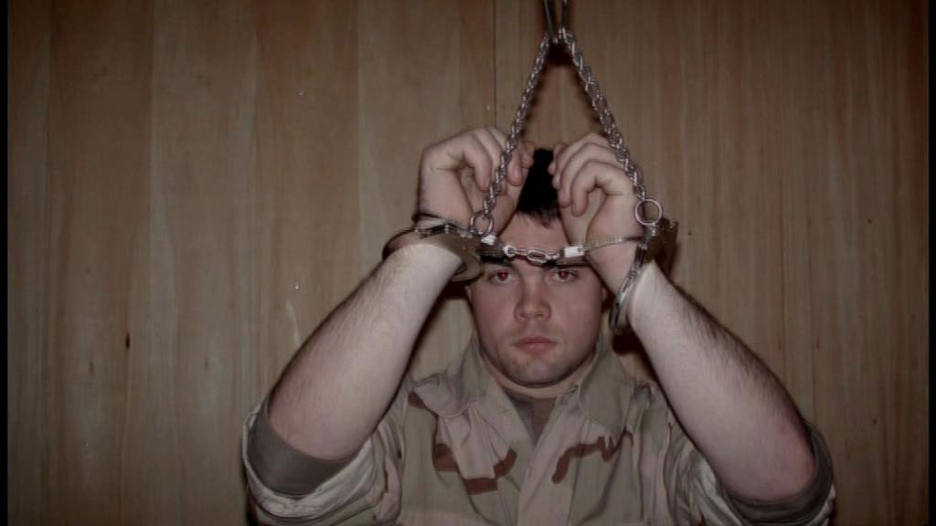 Military Investigation Reenactment and you just kind of chain them up like that ... out to the sides, like this. [Narrator] Forced standing for long periods had inflamed tissue damage from blows to Dilawar's legs. But the initial Bagram press release failed to mention overhead shackling and beatings. It declared that both detainees had died of natural causes. _______________