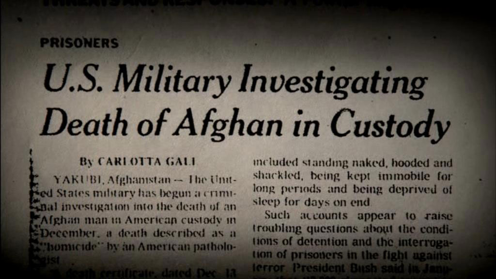 New York Times, March 4, 2003 The United States military has begun a criminal investigation into the death of an Afghan man in American custody in December, a death described as a ''homicide'' by an American pathologist. A death certificate, dated Dec. 13 and signed by Maj. Elizabeth A. Rouse, a pathologist with the Armed Forces Institute of Pathology, based in Washington, says the man died as a result of ''blunt force injuries to lower extremities complicating coronary artery disease.'' The Afghan, known by the single name Dilawar, a 22-year-old farmer and part-time taxi driver from this village in eastern Afghanistan, died in December while being held in the main United States air base at Bagram, north of Kabul. Details of his death have not been made public by the United States Army, which said simply that Mr. Dilawar had coronary artery disease and had died of a heart attack. He was found collapsed in cell on Dec. 10, shortly after being detained near the perimeter of an American Army base in southeast Afghanistan. Two former prisoners, Abdul Jabar and Hakkim Shah, who recalled seeing Mr. Dilawar at Bagram, said the conditions to which they themselves were subjected at the time included standing naked, hooded and shackled, being kept immobile for long periods and being deprived of sleep for days on end. Such accounts appear to raise troubling questions about the conditions of detention and the interrogation of prisoners in the fight against terror. President Bush said in January that ''3,000 suspected terrorists have been arrested in many countries.'' He added that ''many others have met a different fate'' and ''are no longer a problem to the United States.'' Lt. Gen. Daniel K. McNeill, the United States commander of the coalition force in Afghanistan, interviewed at Bagram air base north of Kabul, said every aspect of Mr. Dilawar's death was being examined in a continuing criminal investigation. General McNeill acknowledged that prisoners had been made to stand for long periods. But he denied that they had been chained to the ceiling or held in chains attached to the ceiling and said he was confident that conditions at Bagram did not endanger lives. ''Our interrogation techniques are adapted,'' he said. ''They are in accordance with what is generally accepted as interrogation techniques, and if incidental to the due course of this investigation, we find things that need to be changed, we will certainly change them.'' Found in this small village, Mr. Dilawar's elder brother, Shahpoor, produced the death certificate, saying he had kept the document in his pocket since it was handed over to his uncle by a United States military officer in Kabul along with his brother's body on Jan. 17. He said he did not fully understand what the paper said. The certificate describes the circumstances of death: ''Decedent was found unresponsive in his cell while in custody.'' Under ''mode of death,'' there are four boxes listing ''natural, accident, suicide, homicide.'' The box for homicide is marked with a capital X. The United States military confirmed the authenticity of the document, although it had not disclosed its existence before its discovery here in this eastern Afghan village. Chris Kelly, public affairs director at the Armed Forces Institute of Pathology, speaking from Washington, said Major Rouse had taken part in the autopsies of two Afghan men who died in custody at Bagram last year, one of whom was Mr. Dilawar. ''She is part of a global response team and any time we have suspicious, unusual deaths, or deaths that are not natural, our medical staff would go out,'' he said. ''This is a typical case we would go to.'' Major Rouse would not be available for interview, he said. The spokesman for the United States-led force in Afghanistan, Col. Roger King, said in an e-mail message that the choice of the box ''homicide'' to describe the death meant only that ''the doctor felt something besides the other choices listed (natural, accident, suicide) led to the death.'' What exactly Dr. Rouse meant by ''homicide'' is not clear. Nor is the precise way in which Mr. Dilawar was treated, but Mr. Shah, the former prisoner, said he had seen Mr. Dilawar with his feet chained. He could not attest to other specific conditions of the dead man's detention. So far no military personnel have been arrested or suspended in connection with the death, nor have any changes been made to routines inside the detention center, General McNeill said. ''We haven't found anything that requires us to take extraordinary action,'' he said. ''We are going to let this investigation run its course.'' He described Mr. Dilawar as having an advanced heart condition and said his coronary arteries were 85 percent blocked. Another Afghan man also died in American custody on Dec. 3. He was Mullah Habibullah, brother of a former Taliban commander. He was about 30, from the southern province of Oruzgan, and was held in the same detention center at Bagram. His family said no American official had given them any information or explanation about the death, which was learned from the International Committee of the Red Cross. Neither man's family has received compensation for the deaths. ''Only God knows why he died,'' Hajji Rahim Gul, his father, said in an interview by satellite telephone from his hometown of Tirin Kot, Orzugan's provincial capital. ''I am an old man. I don't know what happened to him.'' The United States military said Mr. Habibullah had died of a pulmonary embolism, or a blood clot in the lung. Both men died within days of arriving at Bagram air base. They were being held in interrogation cells on the second floor of the detention building, a large hangar divided into isolation and interrogation cells upstairs, and an open-plan detention area downstairs, according to descriptions provided by the two former detainees, Mr. Jabar and Mr. Shah, and others. They described as many as 100 prisoners held there, separated into grou