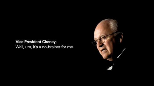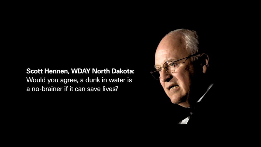 35% of Americans polled believed that torture was acceptable under some circumstances. Murdered detainee, Abu Ghraib Even after the Abu Ghraib photographs. And I think that shows the way that this kind of popular culture has built a constituency for torture ... which allows the Bush White House to get away with the way it twists laws and treaties ... and doesn't spark popular outrage. [Narrator] On a conservative radio show, Vice-President Dick Cheney openly defended the practice of waterboarding. [Scott Hennen, WDAY North Dakota] Would you agree, a dunk in water is a no-brainer if it can save lives? [Dick Cheney, Vice President] Well, um, it's a no-brainer for me ...