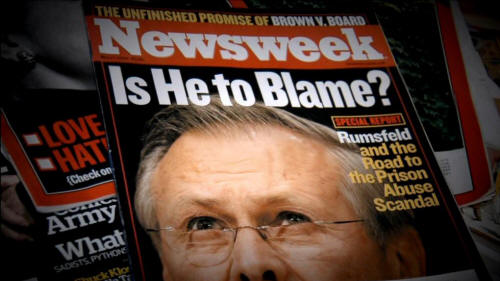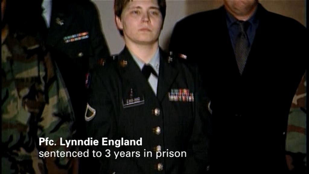 [Narrator] In the wake of media attention surrounding Abu Ghraib, the military began a series of investigations. [Secretary of Defense Donald Rumsfeld, Abu Ghraib, 2004] The people who engaged in abuses will be brought to justice. The world will see how a free system, a democratic system, functions and operates transparently with no cover-ups. Newsweek: Is He to Blame? Special Report: Rumsfeld and the Road to the Prison Abuse Scandal [Rear Admiral John Hutson, (ret) Judge Advocate General] The Secretary and others have said, "Well, you know, we've conducted 12 investigations" -- each and all of which were geared to looking downward, down toward Lynndie England and Graner, and not looking up. Pfc. Lynndie England, sentenced to 3 years in prison.