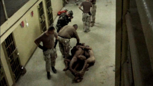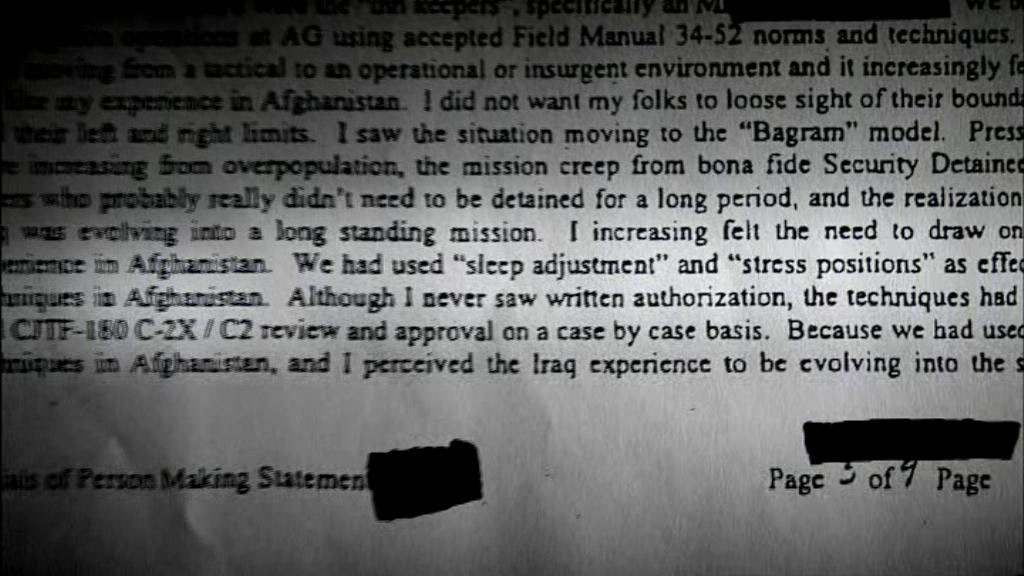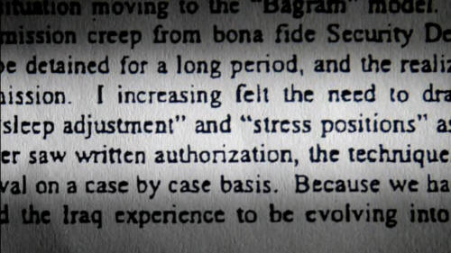 so she brought unauthorized techniques: dogs, nudity, sleep deprivation and stress positions ... to Abu Ghraib from Afghanistan. Wood maintained that the Bagram model had tacit approval from superiors. But U.S. Central Command had never responded to her requests for authorization. So the mystery remained. Was Abu Ghraib the work of a few bad apples? Or evidence of a new world-wide system of detention and interrogation? [Spc. Tony Lagouranis, Military Intelligence, Iraq] I'm pretty sure that interrogators were telling the guards: "Strip this guy naked ... chain him up to the bed in an uncomfortable position ...