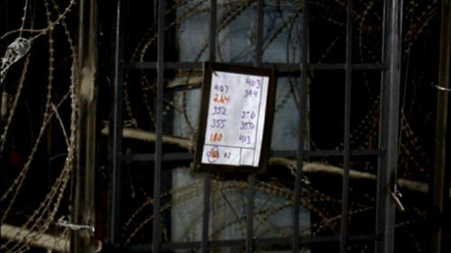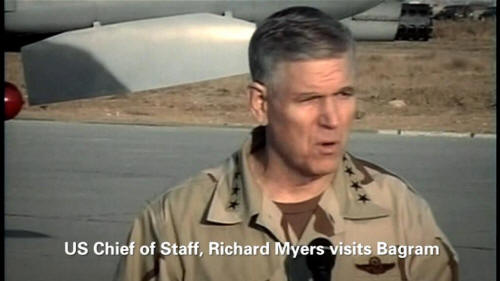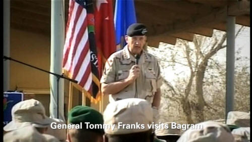 So that would be an hour up. He's got to stand up for one hour. And then you may see a "2" with an arrow pointing down. That means he can sit down for two hours. [Tim Golden, New York Times Reporter] The prisoners were kept in these big pens downstairs. And their numbers would be scribbled on the door of the airlock, which was the little passageway that they were taken out of when they were brought up to the isolation cells upstairs. [Moazzam Begg, British subject detained at Bagram and Guantanamo 2002-2005] Detainees were actually chained, with their hands above their heads, in these airlocks. His number, "421," was something I could see often, because his back was towards me in the airlock ... and the numbers were written on the backs of the detainees in black marker. And we all had that. As well as on the front. My number in Bagram was 180. But later it became "558." [US Chief of Staff, Richard Myers visits Bagram] Thank you. It's good to be with you. It's good to be here in Bagram. General Tommy Franks visits Bagram