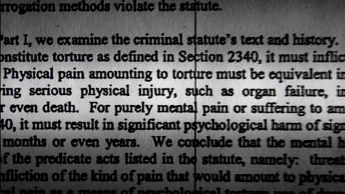 interrogating prisoners ... would not be accused of torture ... John Yoo co-authored a memo that would clarify the meaning of the term. [Senator Carl Levin, Senate Armed Services Committee] The only prohibited acts would be extreme acts ... which are equivalent to serious physical injury, such as organ failure, impairment of bodily functions ... or even death. That's an illegal memo. That's the so-called "torture memo." [Alberto Gonzales, Attorney General Confirmation Hearing] That was an arguable interpretation of the law.