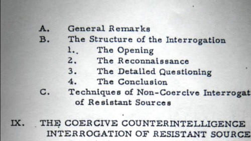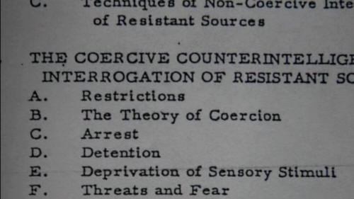 For days at a time while fluids flowed to the legs ... and they put them together in the Kubark Counterintelligence Interrogation Manual. And they propagated it around the world and through the U.S. Intelligence community. Think about what al-Kahtani was subjected to, okay? First of all, he's in dark, he's in light. He's in cold, he's in heat. What they are doing is they are attacking his universal sensory receptors.