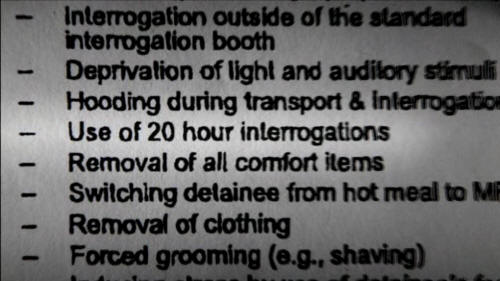 They are also scrambling his time. So that's Phase One. In Guantanamo ... under the regime of General Miller ... he turned Guantanamo into a veritable behavioral scientific laboratory. And Donald Rumsfeld gave orders for techniques beyond the Field Manual. And they percolated. And they percolated in an ambiguous way ... that allowed people to kind of do what they thought needed to be done. And they explore Arab male sensitivity to gender and sexual identity. So that's the thing about being homosexual. The underwear on the head. All that sort of stuff.