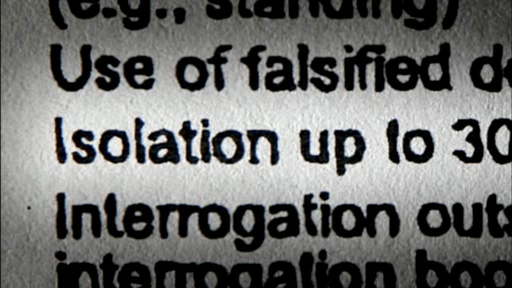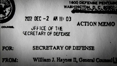 "Detainee's specific phobia techniques": the snakes, the bats, the rats, lock somebody up in a coffin --- you're limited only by your imagination. Any one of these techniques individually could yield the results of torture. Certainly, in combination, you could reach that fairly quickly. [Dr. Donald O. Hebb] See, if you put a person into this procedure, and keep them there for more than the six or eight days that I would think might be the maximum tolerability ... then the price is pretty high. [Narrator] The price is someone's sanity? [Dr. Donald O. Hebb] Presumably, it could be. [Alberto Mora, General Counsel to the Navy, 2001-2006] The medical literature had a phenomenon called "force drift," that made it almost inevitable that the interrogators would continue applying greater and greater increments of force to achieve their desired results. [Col. Lawrence Wilkerson, former Chief of Staff to Colin Powell] For example, take Secretary Rumsfeld's memo: And to say that, "Well, look, he said that dogs have to be muzzled."