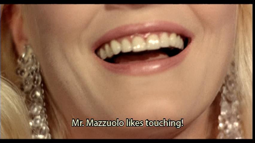 hands? [Anita] It's not raining now, you know? Mr. Mazzuolo likes touching. [Antonio] Watch your mouth. You don't know who I am. You're compromising me. This wicked perfume is going to my head. It makes me feel terrible. |